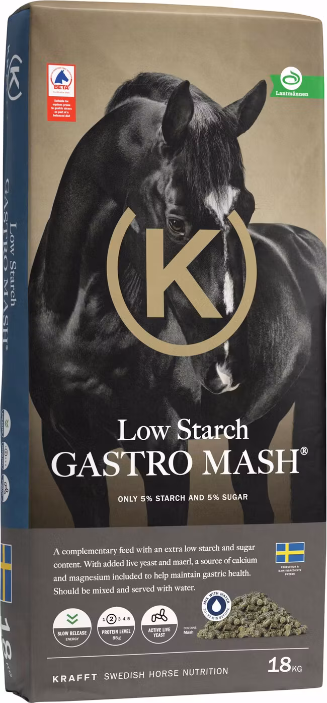 En mash med extra lågt innehåll av socker (5 %) och stärkelse (5 %) som passar alla typer av hästar, från hobbyhästen till den högpresterande individen. Fiberinnehållet är högt och proteinnivån är balanserad. Low Starch GASTRO MASH® innehåller även levande jäst (Levucell®SC) och maerl (Acid Buf®), en källa till kalcium och magnesium som stöttar pH-balansen i magsäcken.